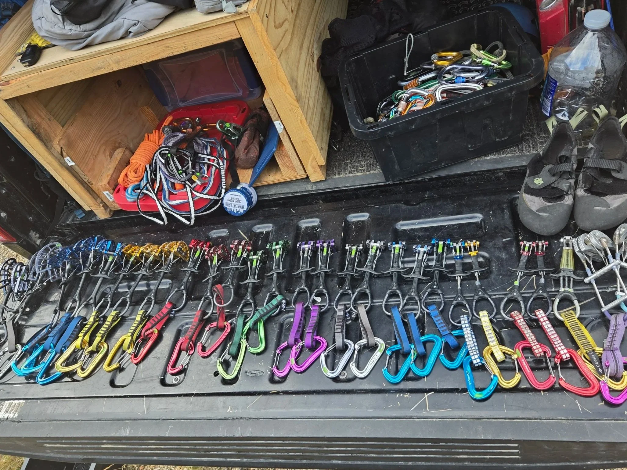 Harness, helmets, carabiners, climbing shoes.